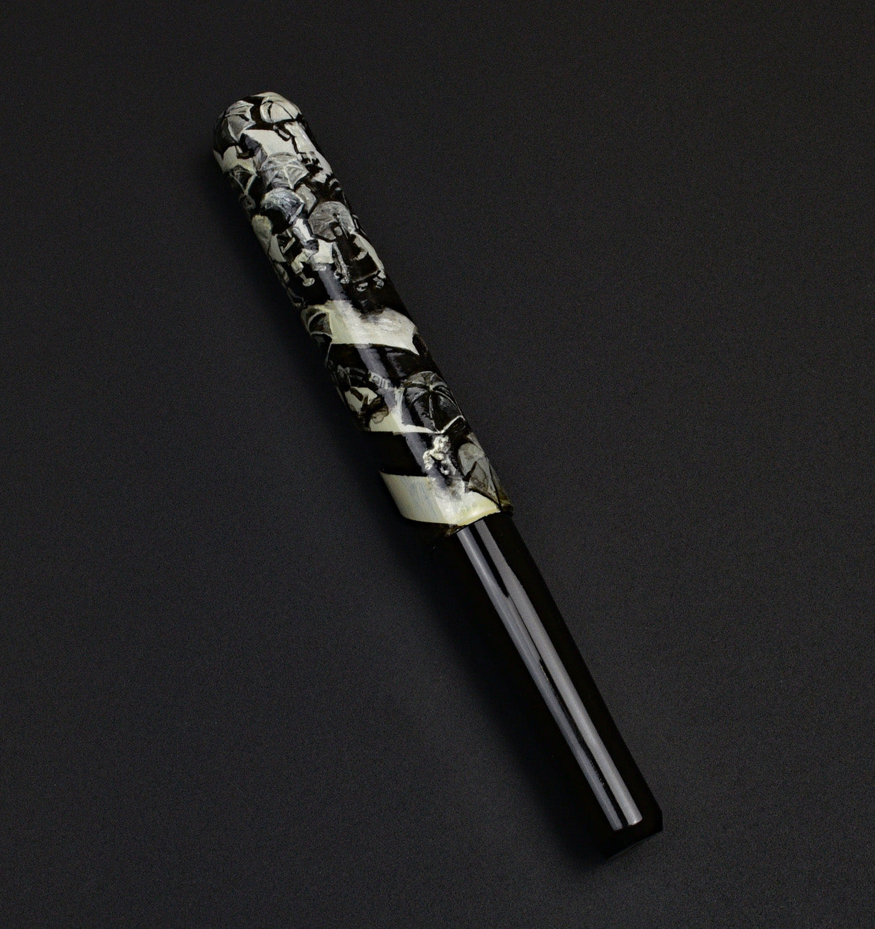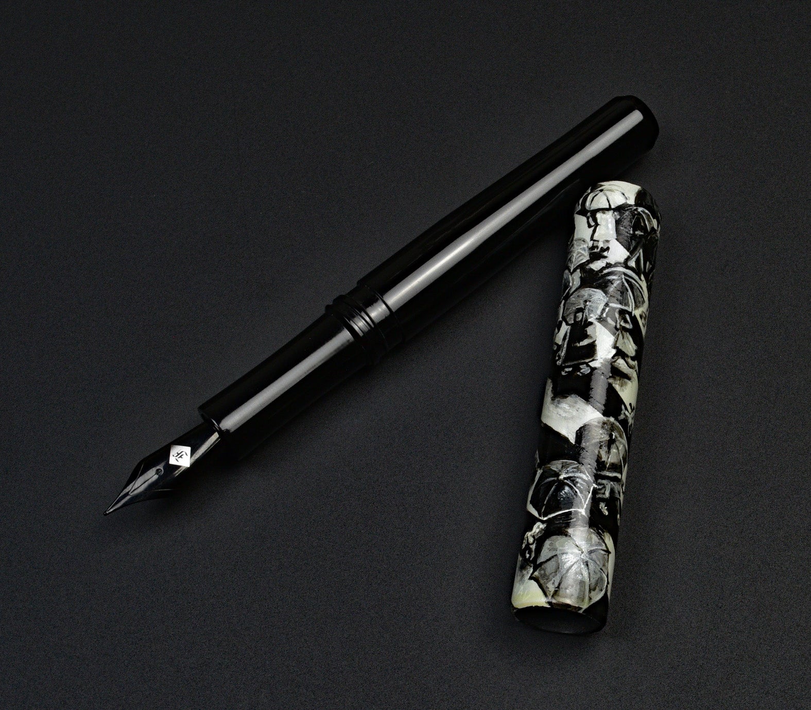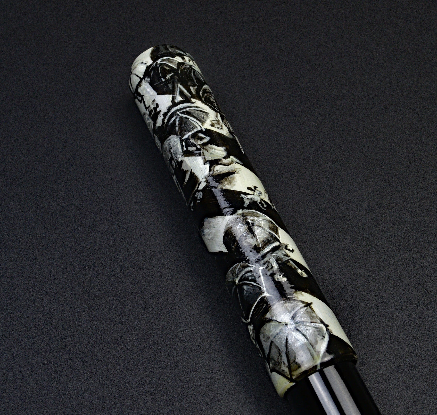 Part of the fun of these Vacharat art pens is discovering the little treasures in the painting that are hard to show all of them in close photos. This is part of the Rain Series, with citizens crossing the street with umbrellas on a rainy day.