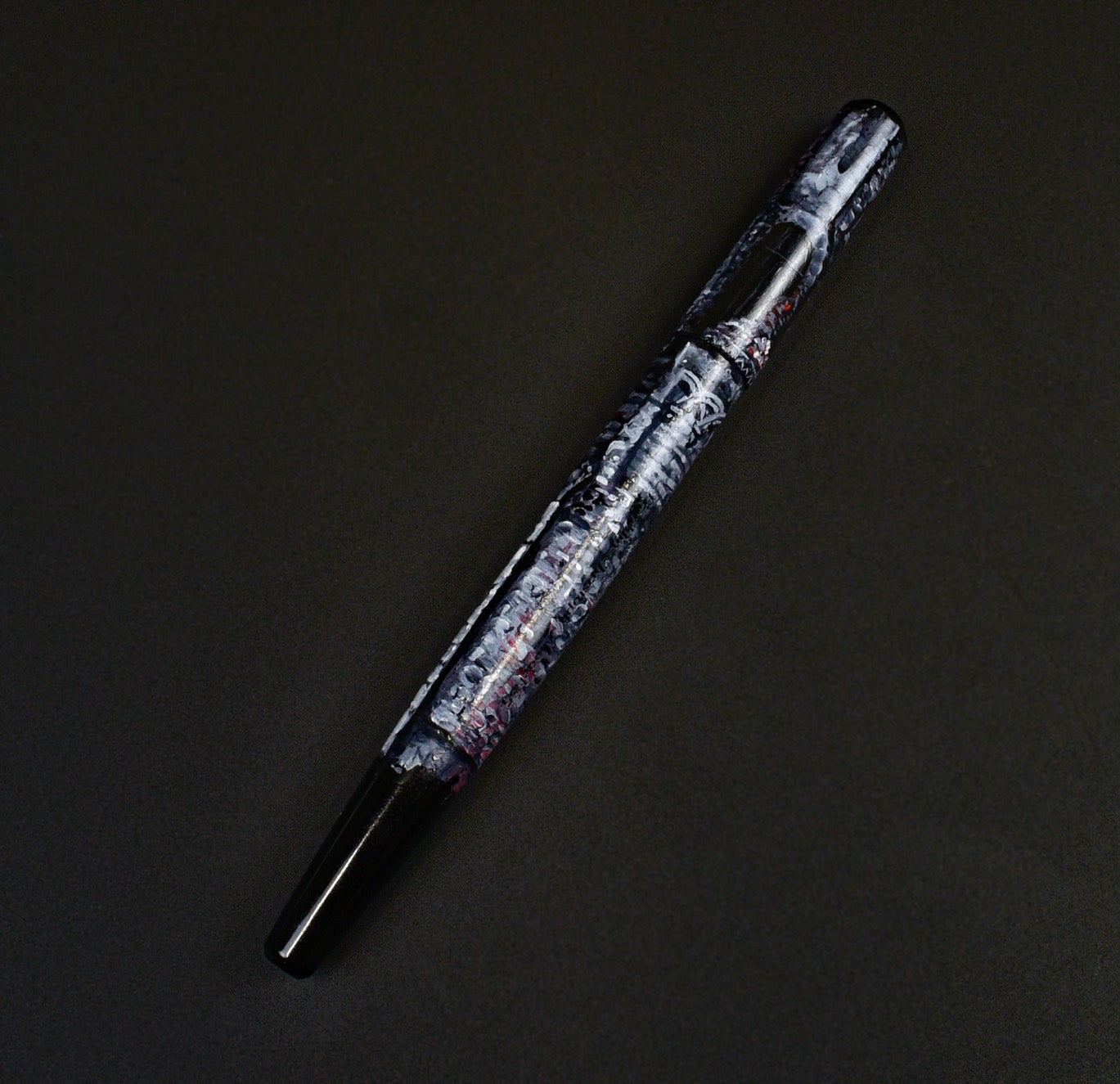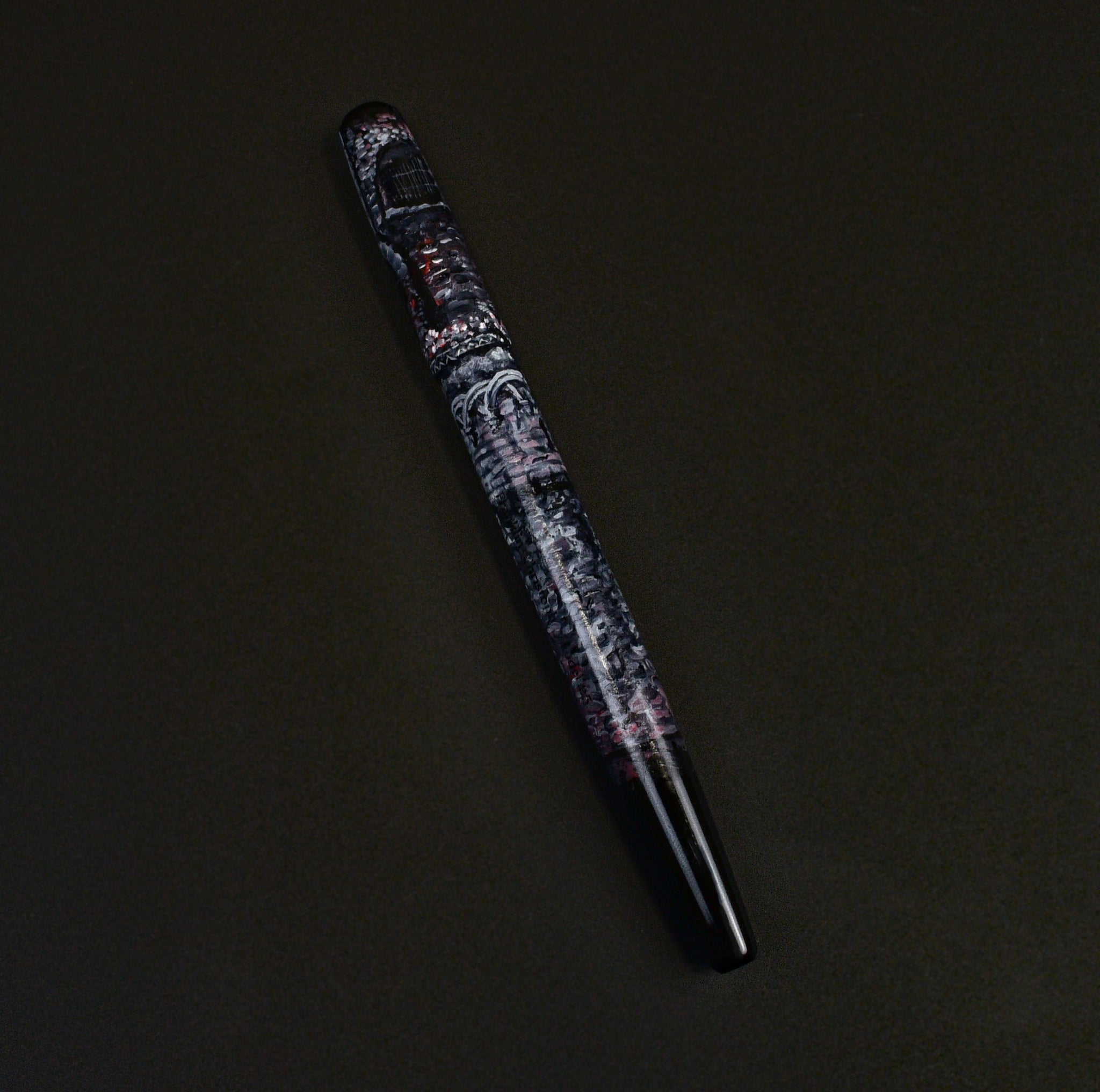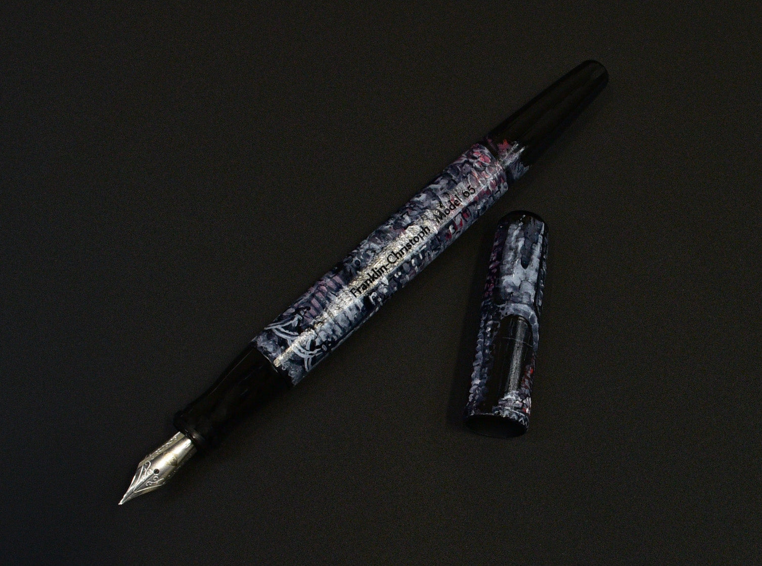 This work of art is on the now retired Model 65 base. Takes a #5 nib. Thin and elegant and a nice little masterpiece full of detail. Scroll your curser over the photo to see some of the little scenes and details. Hints of the abstract as well. 1 piece.