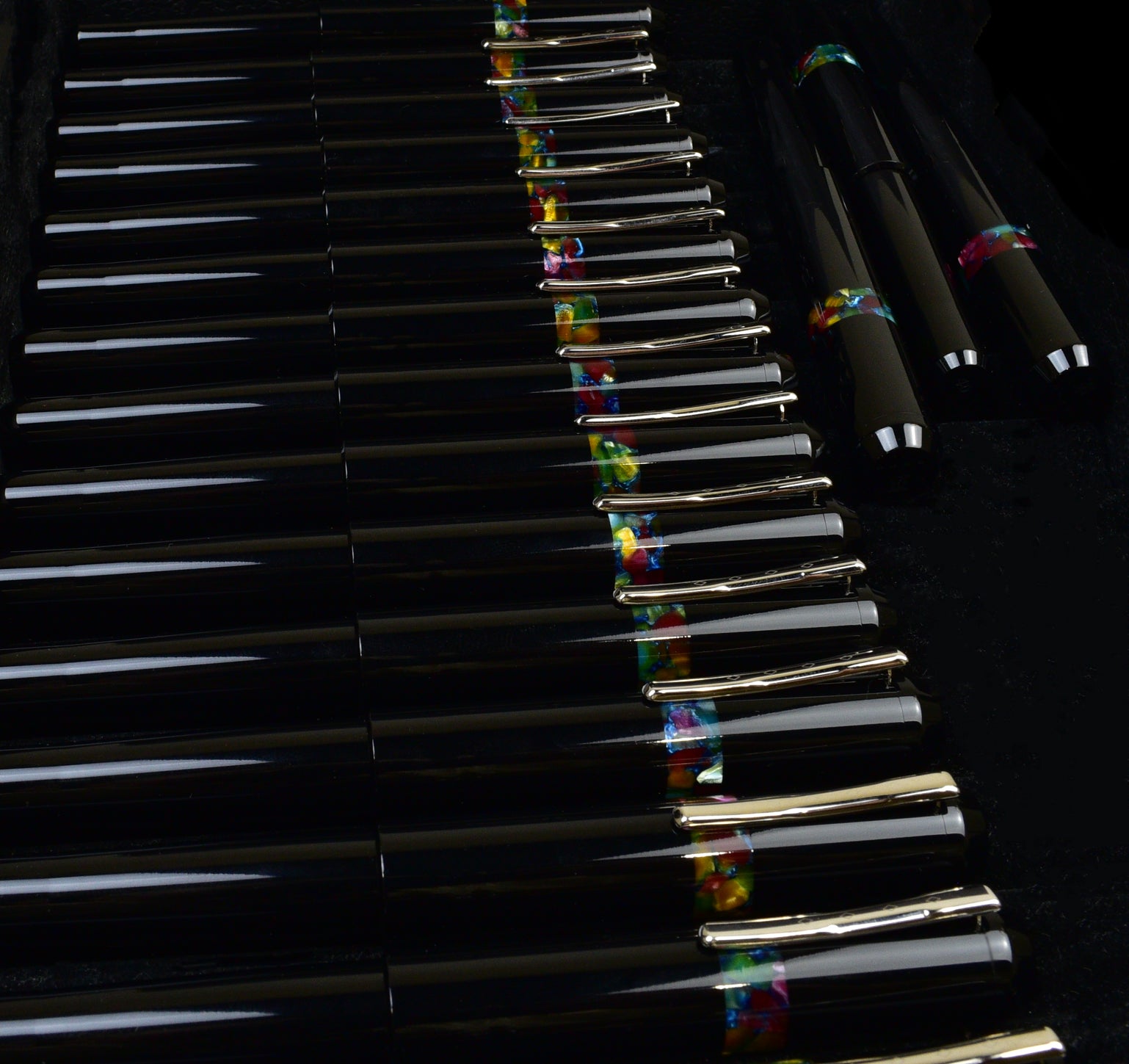** In our recent favorite combo, this is the Panther in black with a cathedral band. The cathedral acrylic has colors that harken stained class of the great cathedrals in reds, blues, greens, and yellows. Each band will be slightly different.