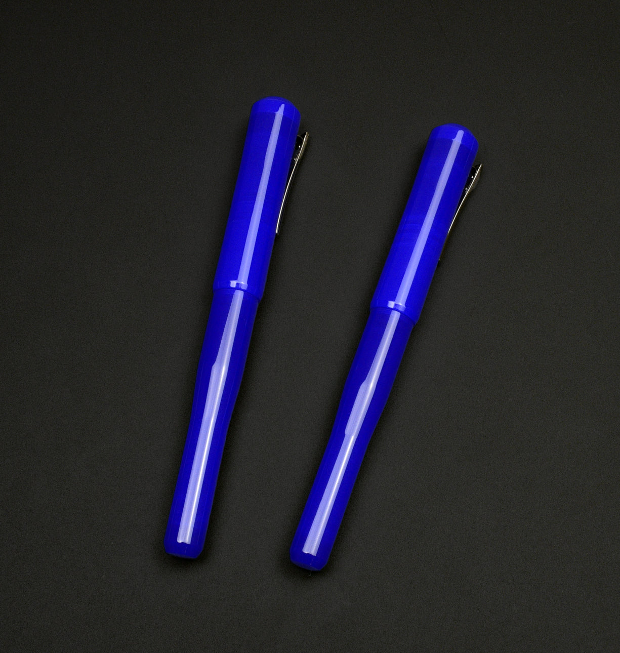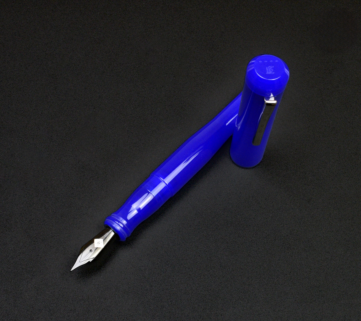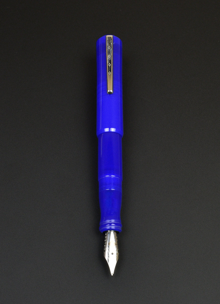 ♦ The Model 02 fountain pen is one of our long time flagship models with some unusual features. Chiefly the center barrel taper, so that the cap posts deeply. This one features our Kyanite blue acrylic.