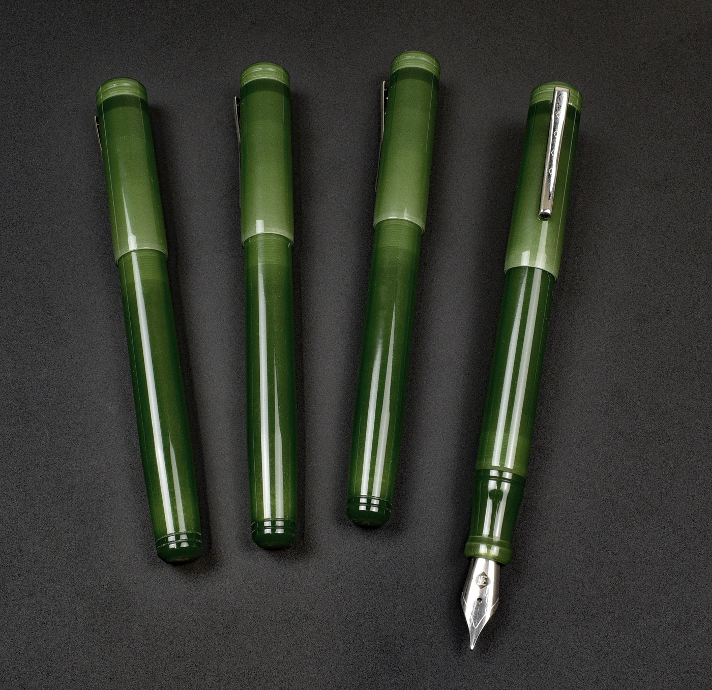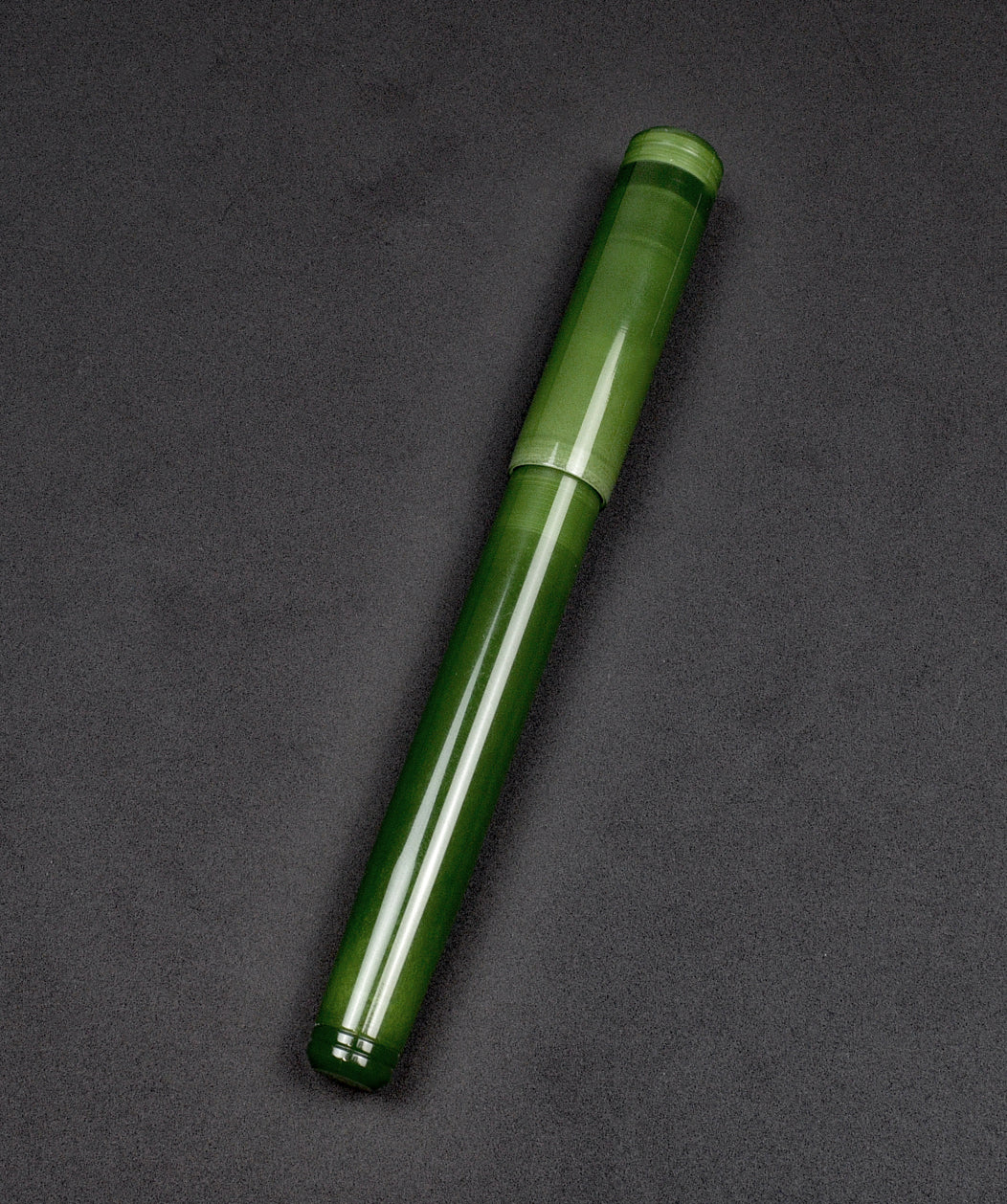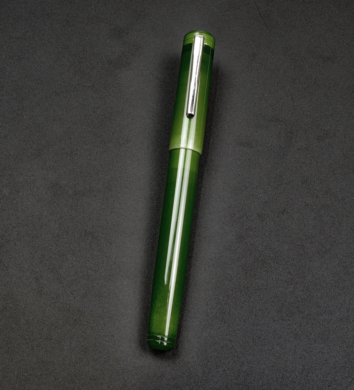 ♦ Presenting the Model 20 Marietta fountain pen- a slip cap fountain pen that harkens back to the aesthetic of classic fountain pens of yesteryear. This one created in our Jade acrylic which has subtle spotting, and is a lighter shade than our traditional vintage green. *Due to the nature of the cap and the recessed nib, we recommend this model for more experienced fountain pen users. It is essential to not pull the cap off with force, and is important to clean the recessed area around the nib, or you'll think the pen is leaking.